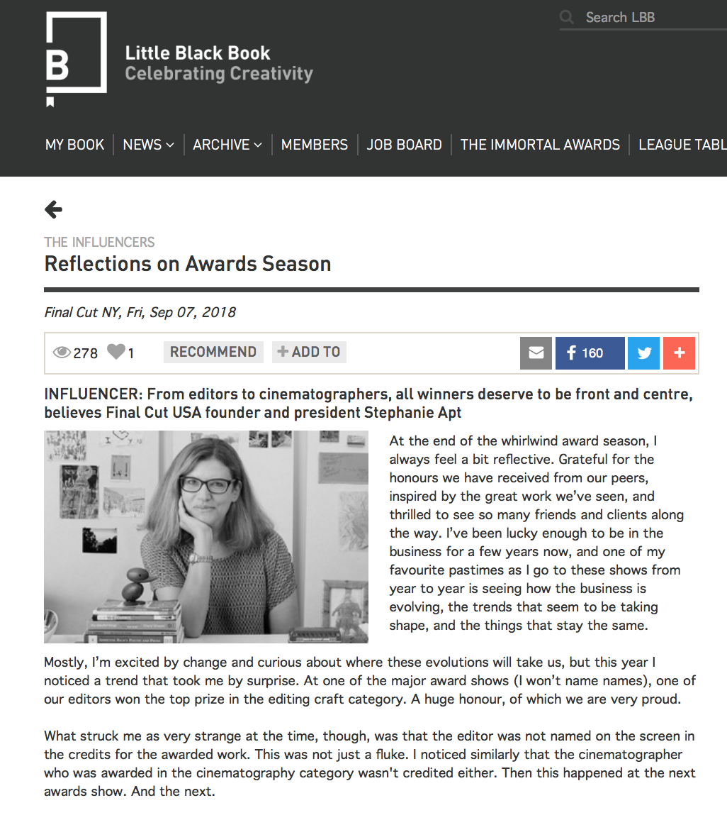 The fabulous Stephanie Apt from Final Cut talks to Little Black Book – LBBOnline about giving credit where credits due in this brilliant article on industry awards.